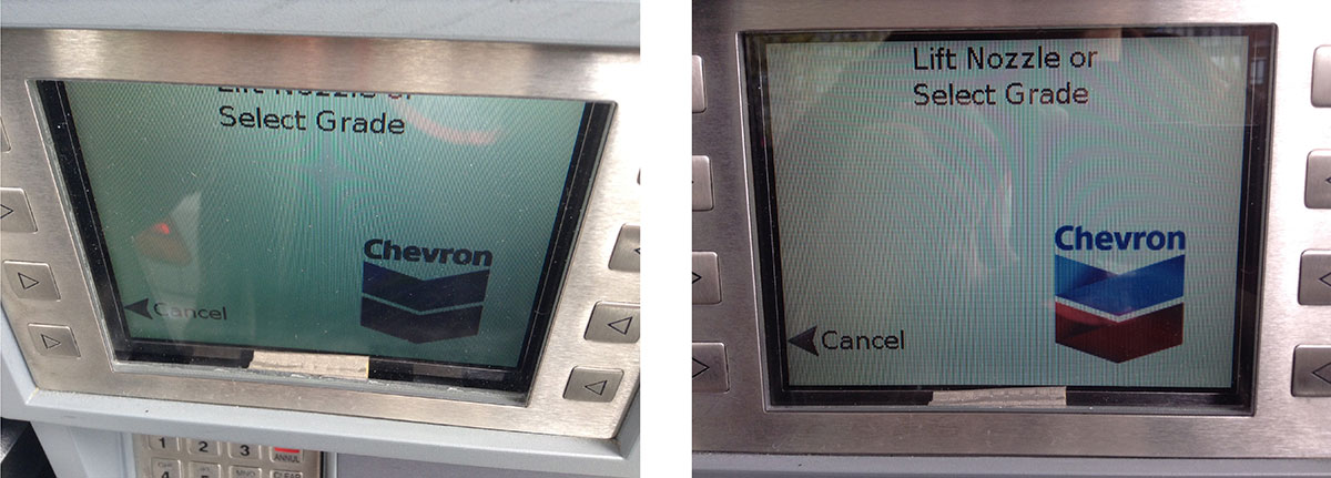 Chevron appears to be rolling out a new design for the screens on their in-pump monitors. Perhaps this is tied to an upgrade on the back end, I don’t know. But there’s a problem… at least for taller customers.